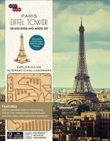 Build and color your own 3D Eiffel Tower and learn all about Paris in this deluxe IncrediBuildsTM book and model set. One of the most recognizable buildings in the world, the Eiffel Tower has long been a source of endless fascination. This deluxe IncrediBuildsTM book and model set features a do-it-yourself, customizable replica of the Eiffel Tower perfect for anyone interested in design, architecture, and of course Paris. A fresh take on this one-of-a-kind French landmark, this set also features a full-color book featuring information on Parisian food, history, and culture. Filled with fun facts and customization ideas, this Eiffel Tower book and model set is a great way to explore your creativity and create unique, displayable art. No glue or tools needed! Includes: Laser-cut, FSC-certified wood sheet with easy-to-assemble pieces Step-by-step instructions Coloring and crafting ideas An Eiffel Tower guidebook, "Exploring an International Landmark""